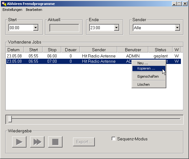 Die Aufnahme Instanz des dbc Loggers erzeugt nach Abarbeiten dieses Jobs automatisch einen neuen Eintrag in der Datenbank für den nächsten angwählten Wochentag. Bei Überschreiten des Aufbewahrungs-Zeitraumes werden die Audiodateien und der Eintrag in der Datenbank automatisch gelöscht.